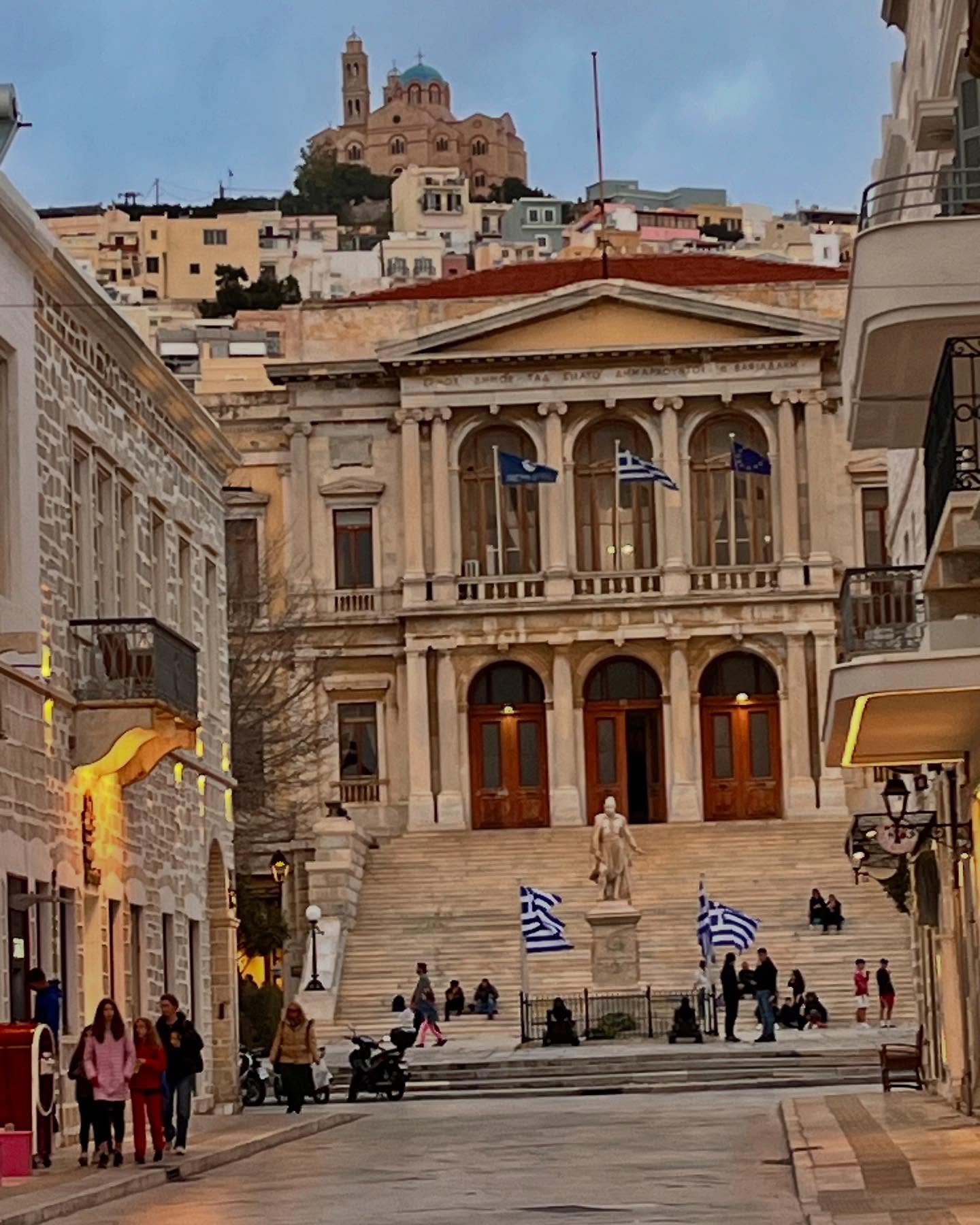 Κατά την άφιξή τους στην Ερμούπολη, οι μαθητές γνώρισαν από κοντά την «Αρχόντισσα των Κυκλάδων», περιηγήθηκαν στην Πλατεία Μιαούλη, θαύμασαν το επιβλητικό Δημαρχείο του Ερνέστου Τσίλερ και επισκέφθηκαν το ιστορικό Θέατρο Απόλλων. Ιδιαίτερο ενδιαφέρον παρουσίασε και η γνωριμία με τη μοναδική συνύπαρξη ορθόδοξης και καθολικής παράδοσης στο νησί, μέσα από τις δύο μητροπόλεις της Σύρου.