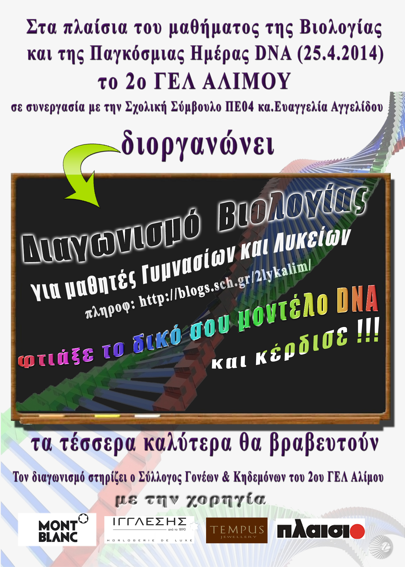 Στα πλαίσια του μαθήματος της Βιολογίας και της Παγκόσμιας Ημέρας DNA (25/4/14), το 2ο ΓΕΛ Αλίμου σε συνεργασία με τη Σχολική Σύμβουλο ΠΕ4 Κα Αγγελίδου Ευαγγελία, διοργανώνει διαγωνισμό κατασκευής μοντέλου DNA με απλά υλικά.