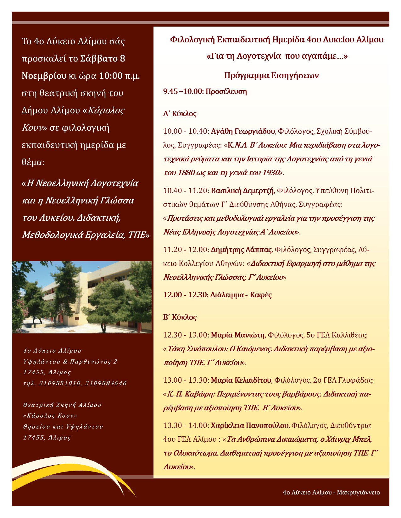 Στις 8 Νοεμβρίου διοργανώθηκε με επιτυχία στη θεατρική σκηνή του Δήμου Αλίμου “Κάρολος Κουν”, φιλολογική ημερίδα με θέμα “Η Νεοελληνική Λογοτεχνία και η Νεοελληνική Γλώσσα του Λυκείου. Διδακτική, Μεθοδολογικά Εργαλεία, ΤΠΕ“.
