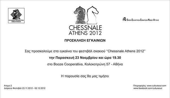 Το cultureout.com το πρώτο διεθνές πολιτιστικό κοινωνικό δίκτυο και η Ελληνική Σκακιστική Ομοσπονδία έχουν την χαρά να προσκαλέσουν εκπαιδευτικούς και μαθητές στην "CHESSNALE ATHENS 2012" ένα φεστιβάλ σκακιού με αγωνιστικές και πολιτιστικές εκδηλώσεις απο τις 23 Νοεμβρίου 2012 μέχρι τις 2 Δεκεμβρίου 2012 στο ιστορικό κέντρο της Αθήνας στο χώρο του Booze Cooperativa.